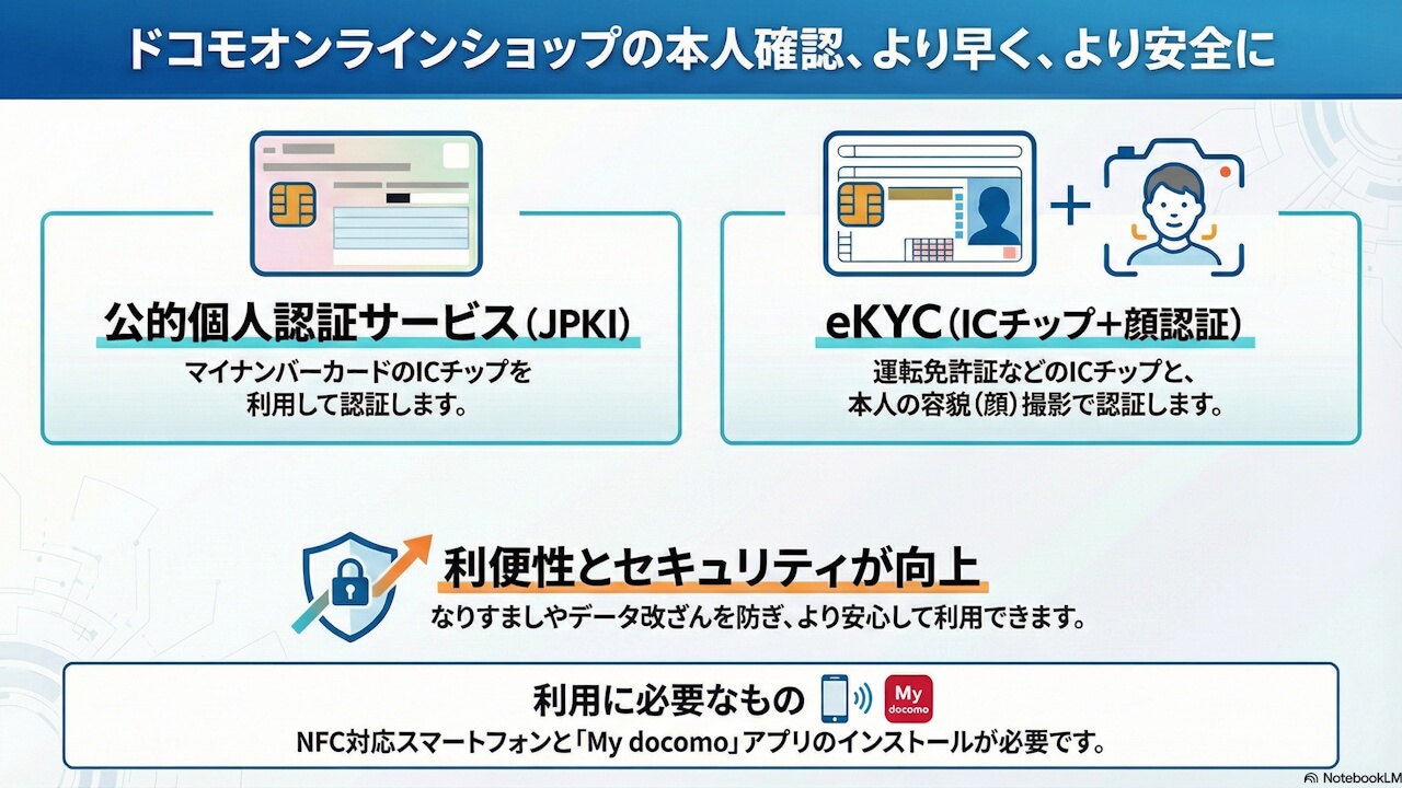 NTT ドコモは 2025 年 12 月 15 日(月)、公式オンラインショップ「ドコモオンラインショップ」における新たに対応する本人確認方法として、「マイナンバーカード」を利用する「公的個人認証サービス(JPKI)」と「運転免許証」などを利用する「IC チップ読み取り + 容貌画像撮影(eKYC)」を追加すると発表しました。