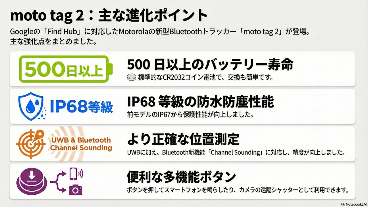 - Motorola、Google 提供の位置情報取得サービス「Find Hub」に対応する新型 Bluetooth トラッカー「moto tag 2」を正式発表。