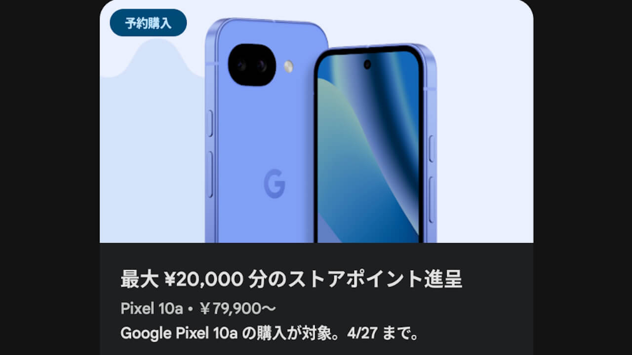 Google Play「Pixel 10a」ストアポイント最大20,000円分進呈オファー展開【2026年4月27日(月)まで】