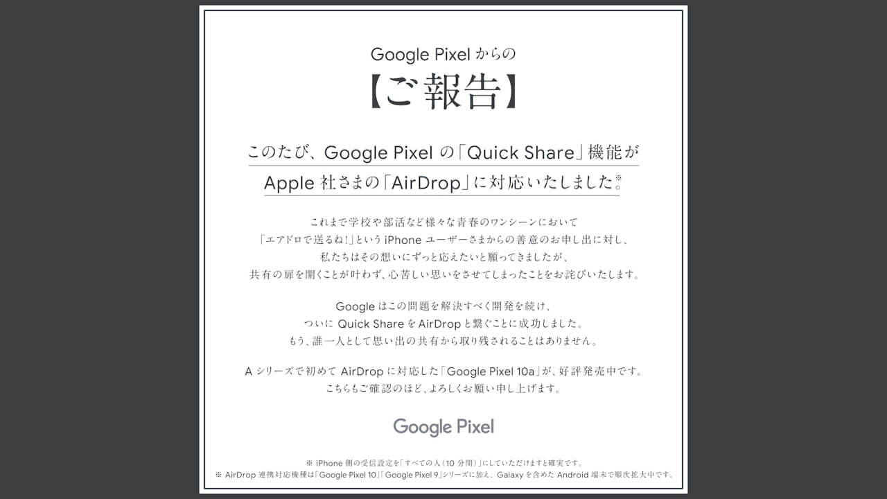 Google 日本国内法人 Google Japan は 2026 年 4 月 10 日(金)、Google Pixel デバイスを中心とした一部の Android デバイスにおける、近距離共有機能「Quick Share」の Apple「AirDrop」対応を報告しました。